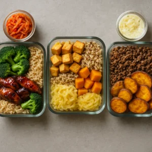 Segue abaixo três sugestões práticas para 5 marmitas cada, que combinam alimentos fermentados com bases simples e gostosas: