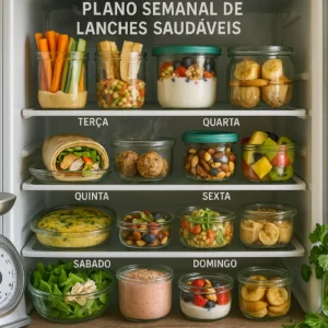 Criar um plano de lanche semanal é uma ótima maneira de garantir que você tenha opções saudáveis sempre à disposição. Aqui está um exemplo prático que utiliza alimentos que já podem estar preparados na sua geladeira: