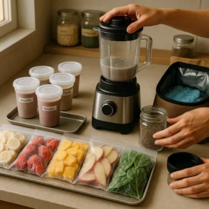 • Cada noite (5 min): bata 1 kit no liquidificador com base líquida e extras desejados (chia, spirulina, etc). Armazene com tampa.